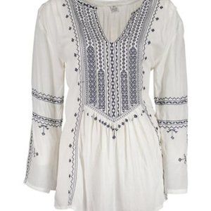*White with intricate navy embroidery