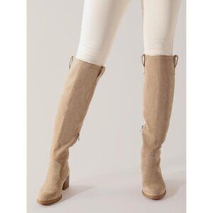 Women's Nude Faux Suede Over The Knee Thigh High Chunky Heel Pointed Toe Boots