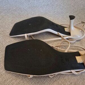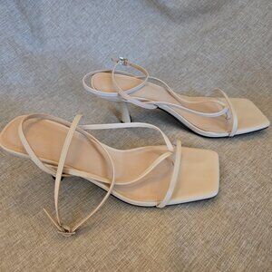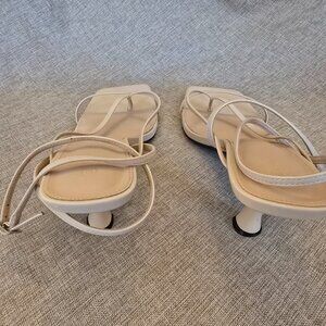 Excellent Condition! Piepiebuy Women's Nude Thong Squared Toe Sandals with Ankle Straps and Kitten Heel, Size 10. Minor flaw on inside of heel - see photo.