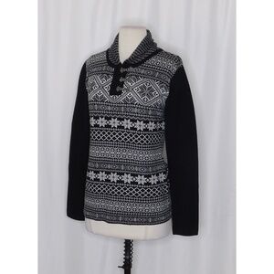 High shawl style collar at neckline … three off-set metal frog closures on the front of the neckline ~ Long sleeves ~ Straight hemline ~ Pullover styling ~ Soft unlined Merino Wool blend knit fabric ~ Body is a Fairisle snowflake pattern in black & white ~ Collar is a contrasting black & white print … sleeves are a solid black color