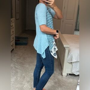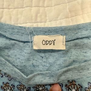 Womens ODDI Top. Light blue multi-pattern top. Longer on the hips/sides. Size medium. No stains or snags. Smoke free home.
