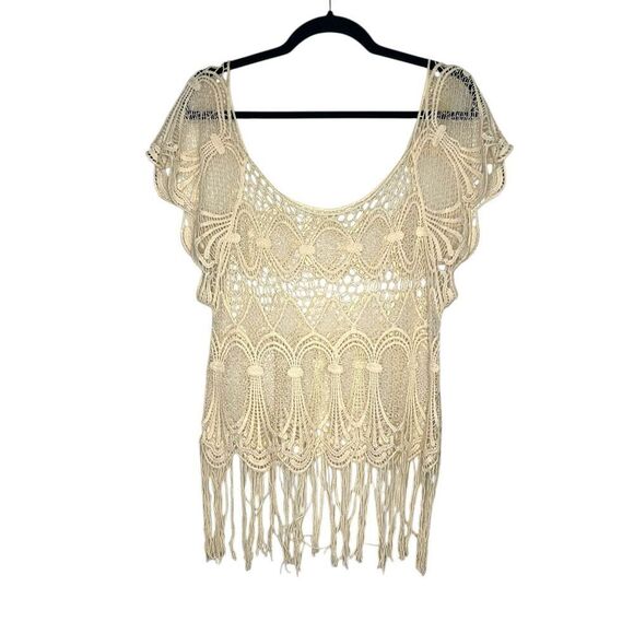 Women’s cream crochet boho top with fringe, super cute as a swim coverup