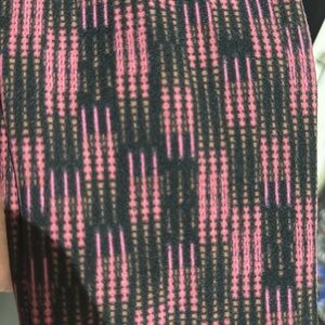 Women’s OS, leggings, pink, black & brownish pattern, no stains or holes. Slight color fade from washing. As shown-in crotch & on thigh, can’t tell when on for me.