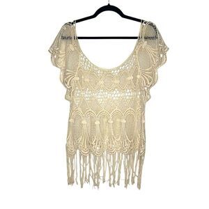 Women’s cream crochet boho top with fringe, super cute as a swim coverup