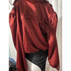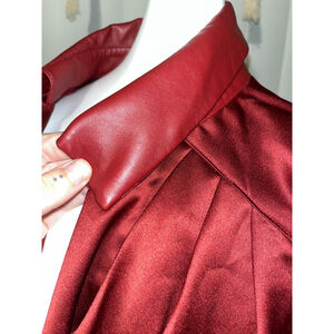 This is an Oak & trellis bodysuit, size medium, in new without tags condition. The top is a shiny, deep red fabric with a faux leather collar and cuffs. It features a plunging neckline and long sleeves with buttoned cuffs. The bottom is a black mesh thong. There are no visible imperfections.