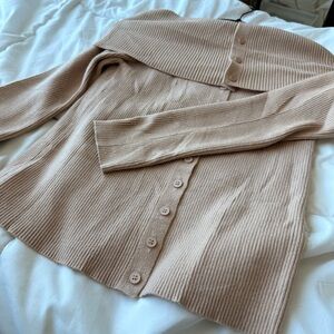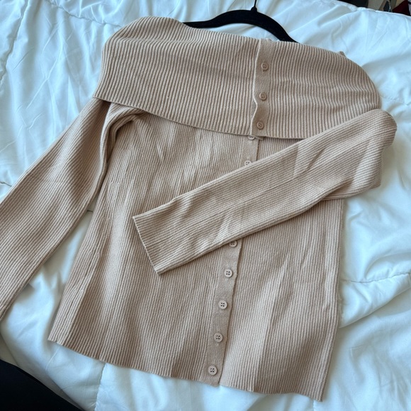Stay stylish and cozy with this off-shoulder ribbed sweater. Perfect for any occasion, this tan sweater adds a touch of elegance to your wardrobe.