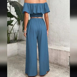 Women's Off-Shoulder Ruffle Trim Top And Wide Leg Pants Two Piece Set