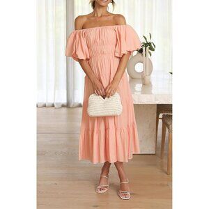 Women’s Off-Shoulder Summer Dress Puff Sleeve Empire Waist A-Line Flowing Midi