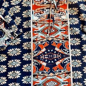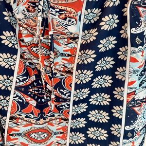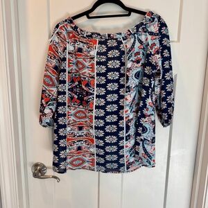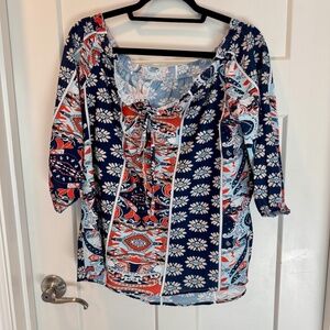 Women's Off-Shoulder Top, Long Sleeve, Navy Abstract, S, NWOT. Boho top features off -shoulder sleeves and notched neckline with shoestring ties. 100% polyester. Measures: 22" arm pit to arm pit and 22" length.