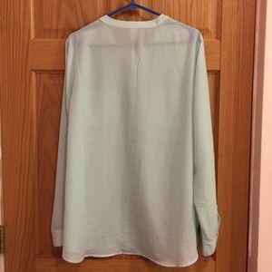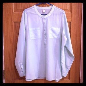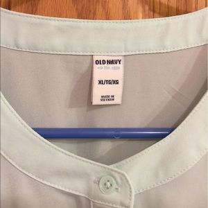 Women's size XL semi- sheer blouse from Old Navy. It's a very light blue color, has 5 buttons down the front that you can adjust to wear buttoned up or as a v-neck. Fairly sheer, so you may need to wear a tank underneath. Light and airy material makes it comfortable to wear. No flaws, just too big for me.