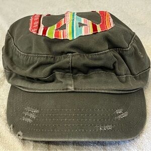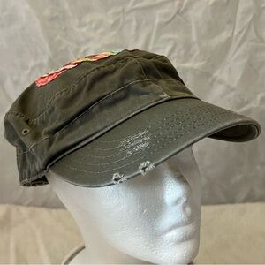 L4 Hat/Cap No ID Adult Adjustable Hook & Loop Strap Rainbow colored Peace Symbol on top of dome with Rainbow flag on side / Distressed Army Green Train Conductor or Newsboy Hat