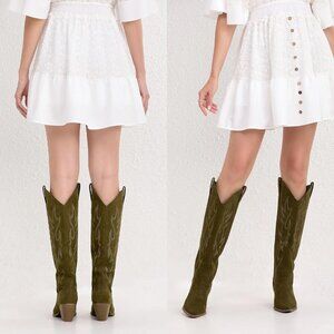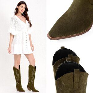 ⚡Women's Olive Knee High Pointed Toe And Block Heel Suede And Faux Leather Boots