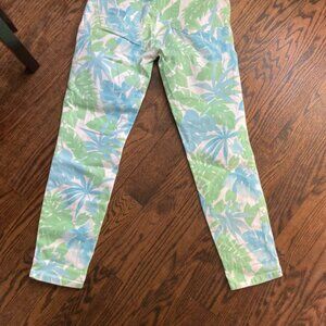 These pre-owned Olsen Europe Ava jeans feature a vibrant tropical print with blue and green leaves on a white background. The material is 97% cotton and 3% elastane. They have a standard five-pocket design with a button and zipper closure. The jeans are in good condition with no visible stains or tears. The size is 8 with a 28-inch inseam. The style is a pipe basic fit.