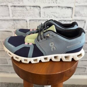 Women’s. On Cloud. Dark blue, light blue, lime and a tiny lilac colored sneakers. Preowned condition. See photos for signs of wear!! Women’s size 7.