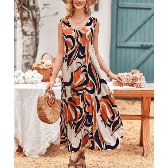 Women's Orange & Black Abstract Sleeveless Scoop-Neck Maxi Dress XL #1991-C4