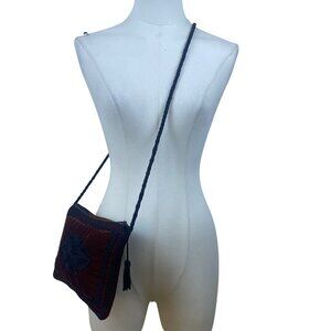 Elegant red velvet crossbody bag featuring intricate black embroidery, braided strap, tassel accent, and zipper closure. Compact yet spacious interior for essentials.