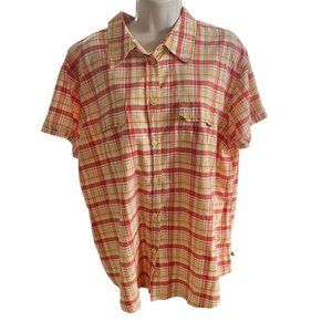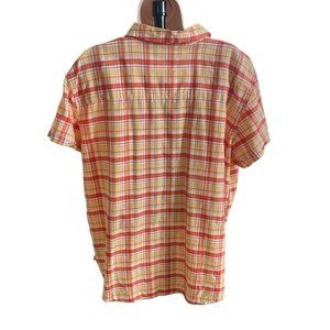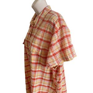 This Route 66 plus size 18W blouse is a stylish choice for women. It features a button-down style, short sleeves, and a vibrant orange, white, and green plaid pattern. Made of soft and comfortable cotton.