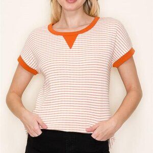 The Calhoun Top is a fun twist on a wardrobe staple. This top features a classic stripe design in burnt orange and ivory with fun orange trim accents. Pair with your favorite denim or layer under a cardigan.