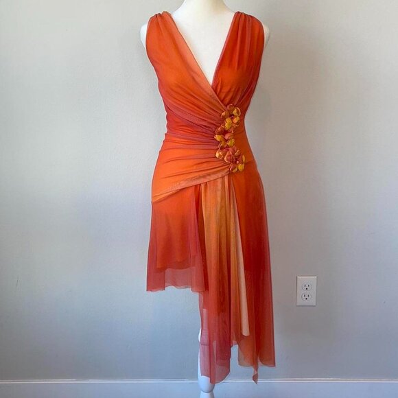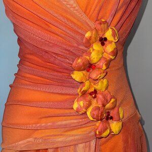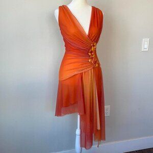 Ema Savahl Couture Orange mini dress hand painted floral detail ruched asymmetrical surplice neckline fairy core stretchy some light wear 🎀