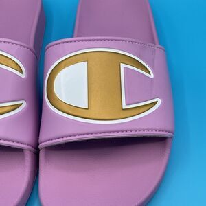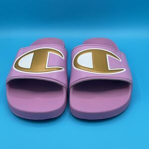 Women’s Orchid/Gold Champion IPO Logo PVC Sports Slide Sandals Size Size 10w.EUC