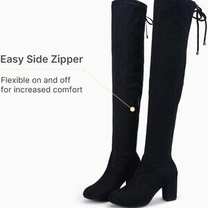 Features: Smooth synthetic leather with a soft, stretchable suede finish that feels great against the skin. The tall shaft contours beautifully to your legs, making them look longer and more elegant. An inner zipper makes these boots easy to slip on and off. Memory foam insoles add a comfy, cushioned feel with every step, while the sturdy block heel gives just the right lift without sacrificing stability. The rubber sole is durable and perfect for winter puddles or dance floors.