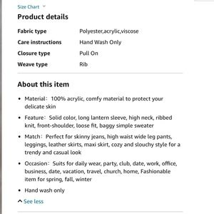 I bought this sweater for a family photo shoot and don’t need it anymore! The material is high quality and thick. I wouldn’t say it’s as "oversized" as the Amazon listing describes, but this sweater definitely pairs well with some jeans. The color is Khaki and a size small - again, perfect condition as I only wore it for a total of 2 hours!