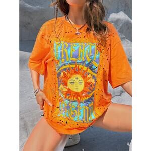 Women's Oversized Drop Shoulder Orange Tee size XS. Runs large. Sun shirt. Create Legend. Ripped and distressed style. High stretch and good quality. 62% polyester 34%cotton and 4 % elastane.