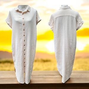 Womens Oversized Shirt Dress M Nude Pink Textured Gauze Button Down Side Slits