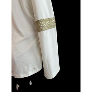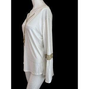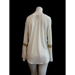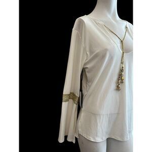 Women’s Oversized Small Blouse Ivory W Gold Rope Jeweled Tie V Neck Flowy NWT