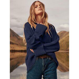 Women's Oversized Sweater Fuzzy Navy Blue Long Sleeve Casual Chunky Pullover