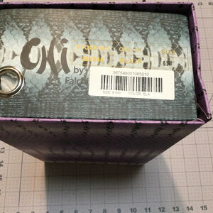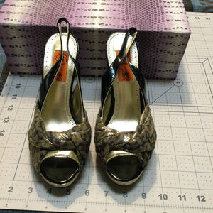 These are a pair of brand new with tags and box, CHI by Falchi heels. They are size 6.5W. The heels feature a black patent leather slingback strap and toe. The upper is a gold and brown fabric with a knotted design. The heel is gold colored. The sole is man-made. The box is purple with a snakeskin pattern and has a label indicating the size and color.