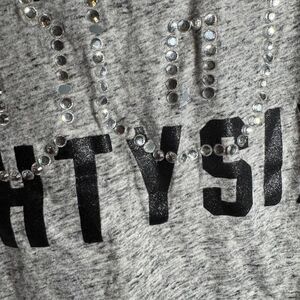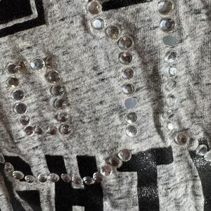 Popular Victoria's Secret PINK Campus Tee. This shirt features an oversized fit and a large logo with bling/gem details. The soft cotton fabric and black/grey color are perfect for a laid-back, casual, streetwear look.