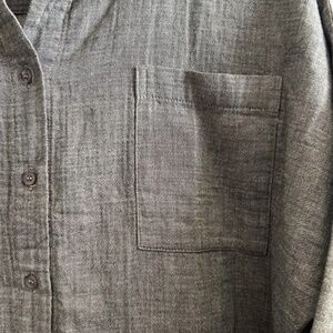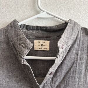 This beautiful shirt comes from POLOLOKO brand. It features yarn-dyed 100% Turkish Cotton in shades of grey. This shirt features a front pocket detail, and buttoned down front closure. The drop-sleeve gives a casual, oversized look. The high collar brings a level of sophistication to any outfit. Easy to move in, this is the ideal shirt for any packed schedule. Folds compactly for travel. It is SO comfortable, but just isn't quite my style. This is NWOT (it did not come with a hang tag). It is a one size fits most piece, and will easily fit a small, medium, or large size. It also looks great unbuttoned as an extra layer.