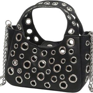 Features: Compact PU leather purse with grommet eyelet details and a chic chain strap. Can be worn as a crossbody or carried as a top handle, great for showing off some streetwear attitude. Small enough to hold essentials like your phone, lipstick, and cards.