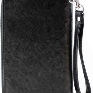 Features: Sleek vegan leather zip-around wallet designed to hold cash, cards, ID, and coins. Features 2 billfolds, 6 card slots, a clear ID window, coin zipper, and a detachable wristlet strap for easy carrying. Spacious enough for larger smartphones like iPhone 11 Pro Max or Galaxy Note 20.