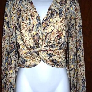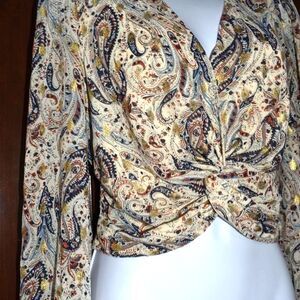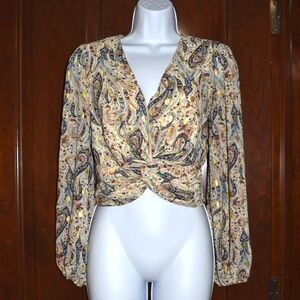 Womens Paisley Long Sleeve Blouse Small Gold V Neck Retro Boho Shimmer Top