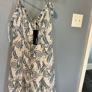 Womens Palm Print Midi Dress Medium Blue White Tropical Leaf Button Up Vacation