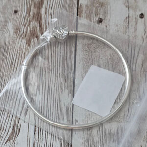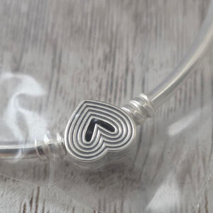 This is a Pandora bangle bracelet, new without tags or box. The bracelet is silver-colored metal and features a heart-shaped charm with concentric heart outlines. The bracelet is in new condition, with no visible scratches or imperfections. The bracelet is secured in a clear plastic bag.