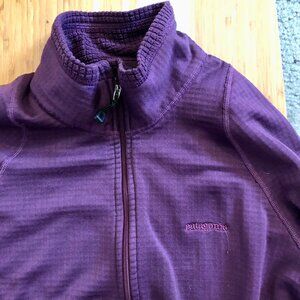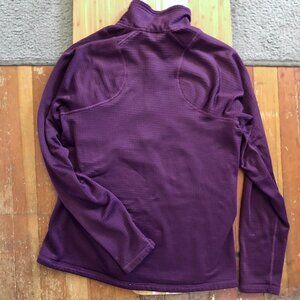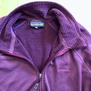 Dark purple 1/4 zip pullover fleece, an older style Patagonia R1 Air. Polartec power grid fabric makes for a warm inner waffle-pattern. Tag is ripped off but it fits like a womens medium. Boxier fit, meant to be worn as a midlayer on top of a thin base layer. Very comfortable, just too big for me.