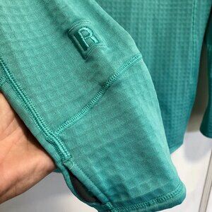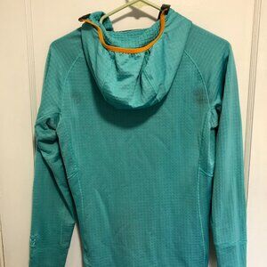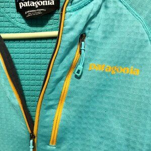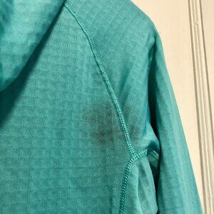 Aqua with yellow/gold accents. Three-quarter zip pullover hoody, with snug fitting balaclava-style hood. Patagonia's Polartec "Power Grid" fabric makes it a stretchy & breathable midlayer for colder seasons. Left chest pocket and thumb holes in sleeves. Torso is slightly longer for staying tucked down under a harness or pack. Some discoloration on upper back/shoulders where my ski touring backpack has worn the fabric. Otherwise no flaws, a very warm layer! Retails between $80-$95 on Worn Wear.