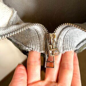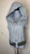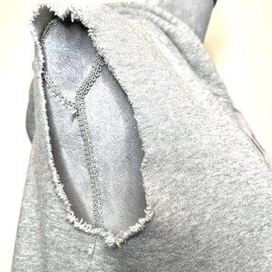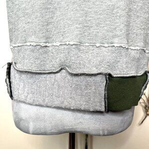 Extremely soft and cozy! Grey hoodie with cut off sleeves and tie dye/patchwork hem. Subtle distressing/fraying on the sleeves, hoodie and bottom. Trim is green, blue and gray tie dye and cable knit with drawstring. Double ended zipper. Relaxed fit. Made from recycled/reworked/upcycled materials.