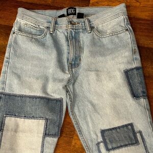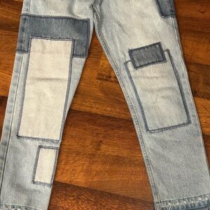 Stylish and unique, these women's patchwork jeans feature a light blue color with distinctive patch designs. Perfect for a trendy and casual look.