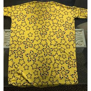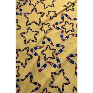 Good condition LULAROE patriotic icicle bomb pop shirt in vibrant yellow comes from smoke free home no stains of any kind perfect for upcoming 4th of JULY freshly laundered prior to shipping measurements as follows and your arm to under arm measures 22 inches long but the shoulder down measures 27 1/2 inches long for the front back drapes lower measures about 28 1/2 inches sleeve length measures 6 inches