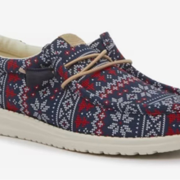 Step out in style with these patterned casual shoes. Featuring a vibrant red and blue design, these shoes are perfect for any casual occasion. Hey Dude Christmas Shoes. Women’s size 6. Never worn. Pet and smoke free home.