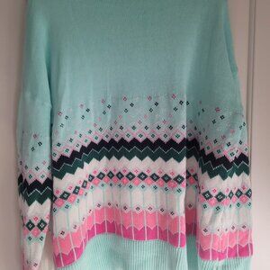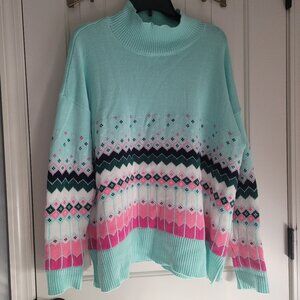 Stay cozy and stylish with this oversized women's patterned sweater. Featuring a delightful mint and pink design, this sweater is perfect for any casual outing. Enjoy the soft fabric and vibrant colors that add a pop to your wardrobe.