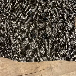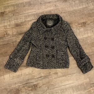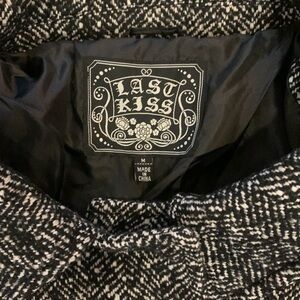 Beautiful white and black, Last Kiss, pea coat. Accented with 6 large buttons, 3 of which button, and front double pockets. Wrist regions are also accented with a cuff and button as pictured.