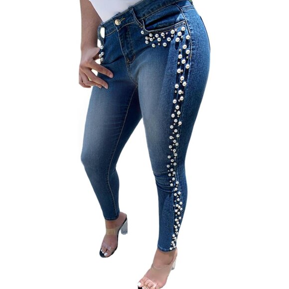 Women's Pearl Jeans Plus Size Skinny Mid Waist Stretch Denim Pants — Elegant with a touch of sparkle.