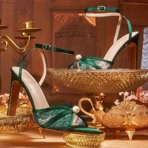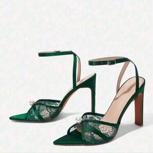 Women's Pearl-Embellished Pointed Toe Square Flat Heel High Heels,Elegant Lace