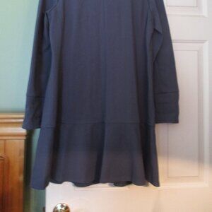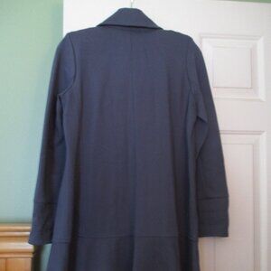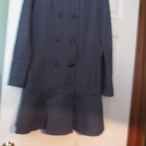 Pre-owned and worn once. No rips or stains. Features collar, shoulder pads, buttons. 70% rayon, 26% nylon 4% spandex. Color is a little darker grey. Very stylish and has a small bit if stretch to it.