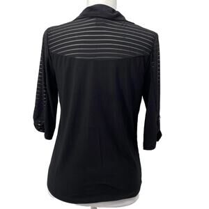Upgrade your casual office wardrobe with this stylish Adele & May Women’s Petite Black Button-Up Blouse in size PM. This top features chic sheer striped panels on the shoulders and sleeves, a flattering collared V-neckline, and functional roll tab 3/4 sleeves. The lightweight stretch fabric (95% Polyester, 5% Spandex) offers comfort and a sleek fit. Easy to care for, machine wash cold, lay flat to dry.